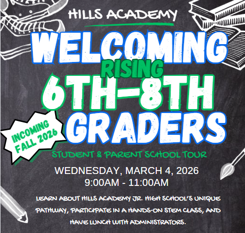 We invite families with rising 6th–8th grade students to join us for a campus tour of Hills Academy in Conyers, GA on March 4 from 9:00 a.m. to 11:00 a.m. This special experience is designed for both students and parents to explore the unique academic and enrichment opportunities Hills Academy has to offer. You will participate in an engaging STEM class, and enjoy lunch with our school community. We look forward to welcoming you, answering your questions, and sharing how Hills Academy supports students during these important middle school years.
